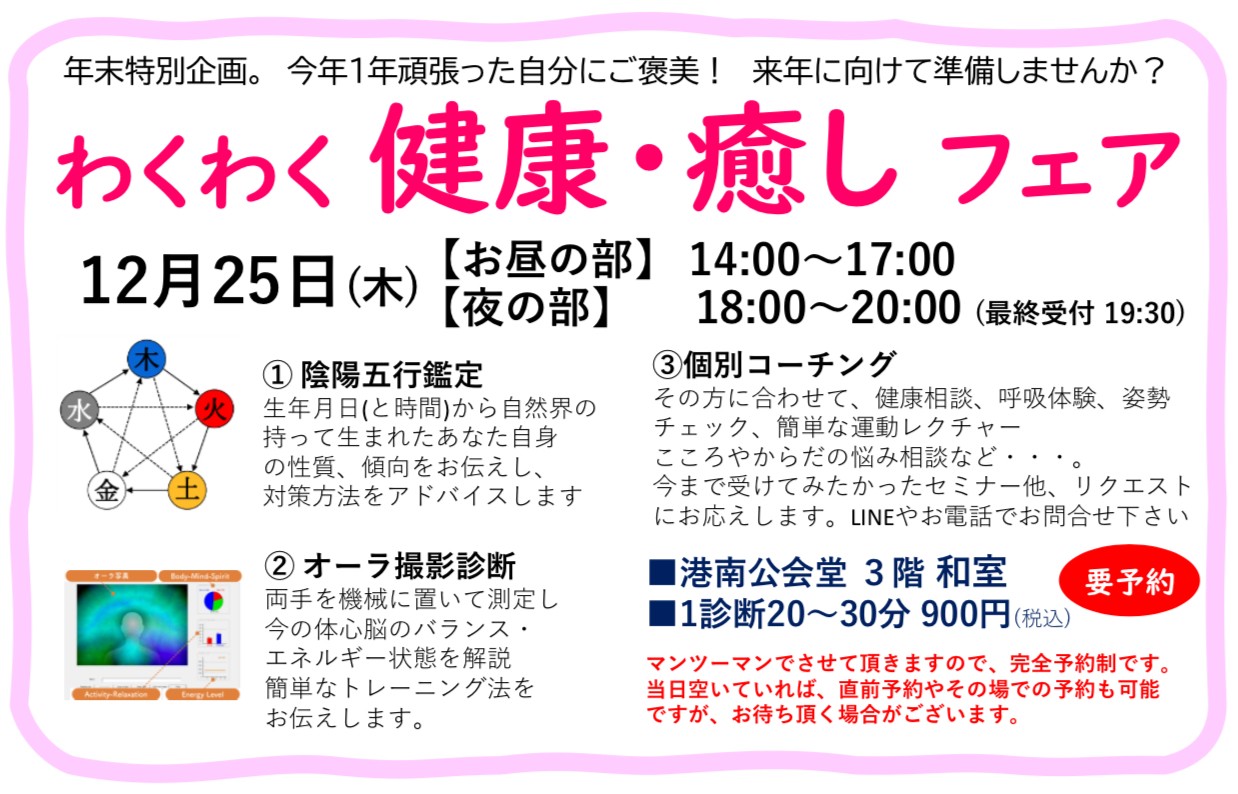 年末特別企画。 今年1年頑張った自分にご褒美! 来年に向けて準備しませんか? ① 陰陽五行鑑定 生年月日(と時間)から自然界の持って生まれたあなた自身の性質、傾向をお伝えし、対策方法をアドバイスします ② オーラ撮影診 […]